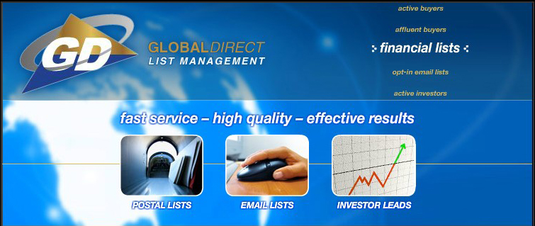 Global Direct is a full service list management company providing the list brokerage industry with top quality direct response postal lists, opt-in email lists and telemarketing lists with a special emphasis placed upon the financial/investor sector.